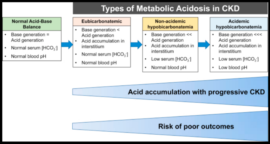 The authors of the article describe metabolic acidosis in CKD as a spectrum, ranging from undetectable changes in ammonia secretion but otherwise normal lab values, all the way to low serum bicarbonate coupled with low blood pH.