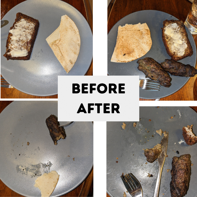 My oldest son started off with the kebabs, bread and banana bread. He ended up trying a zucchini but also informed me it wasn’t too his taste. He also liked the kebabs. Neither of them tried the yogurt sauce. Honestly, I have noticed that my kids often skip the condiments.