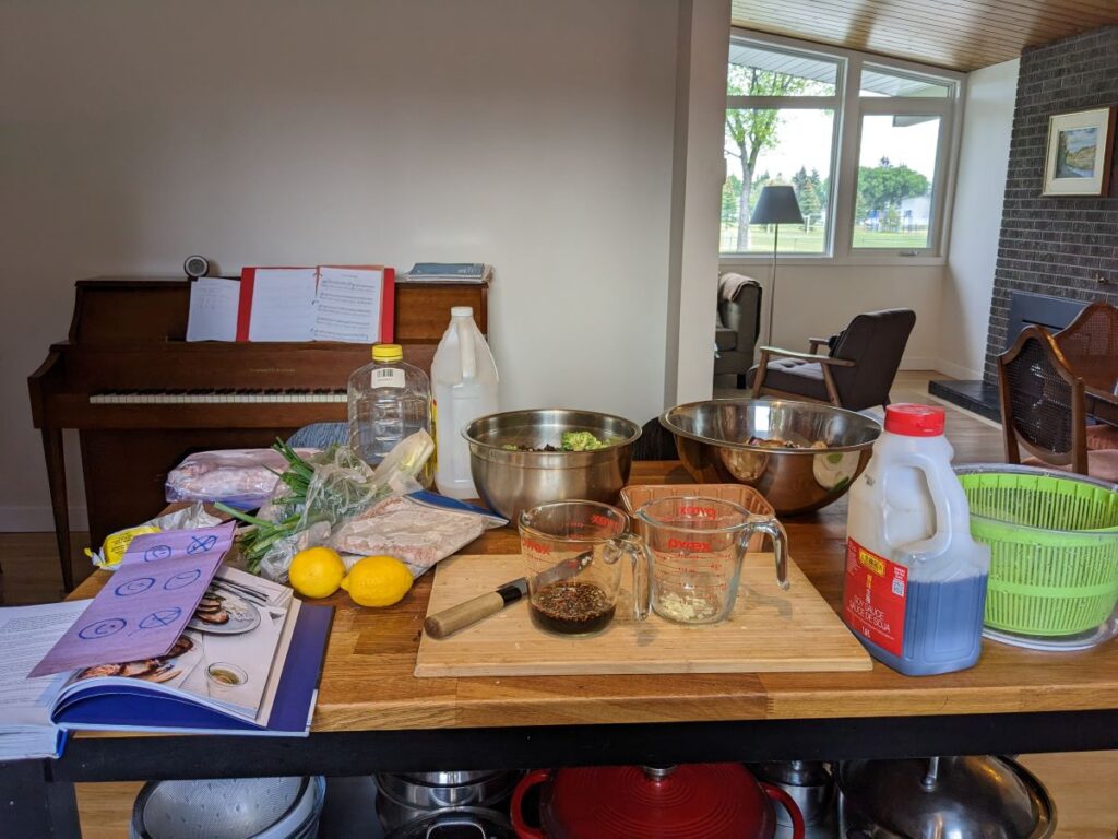 I stopped to take this picture right in the middle of several recipes, but you can see here that I am working on two different marinades at once – both containing garlic but for two different things. I always mix my marinades in my liquid measuring cup because this way I don’t have to use as many dishes – I just use the lines on the side to get the right amounts.