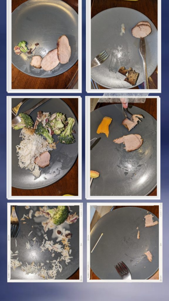 Tonight’s before pictures – show that my one son opted for rice and broccoli salad today but only a small slice of pork. My other son held true to his choice from last night and only wanted the pork. You can also see he had a leftover piece of dried mango from his lunch and a sucker that he got from his piano teacher.