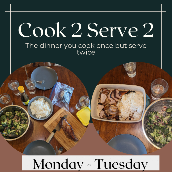 This meal works as a cook once but serve twice meal for a few reasons. First, nothing in this menu wilts or gets icky – for example a romaine lettuce based salad such as Caesar salad will start getting limp within a few hours of adding the dressing.