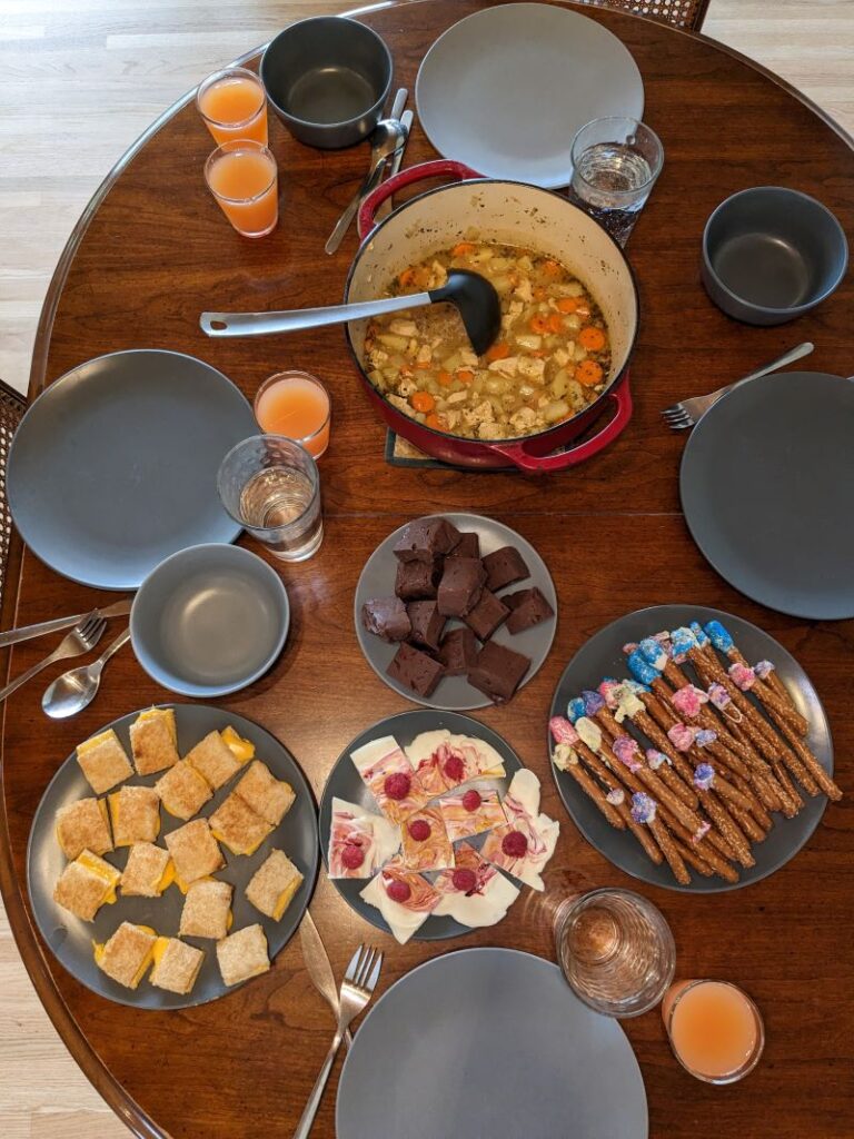 My younger son had no interest in the Almost “Rabbit” Stew and when he set the table didn’t put a bowl or spoon out for himself. Everything else he tried. He loved the Grilled Cheese sandwiches and probably ate the equivalent of about 3. He also liked the juice and torches but left the fugde and the bark.