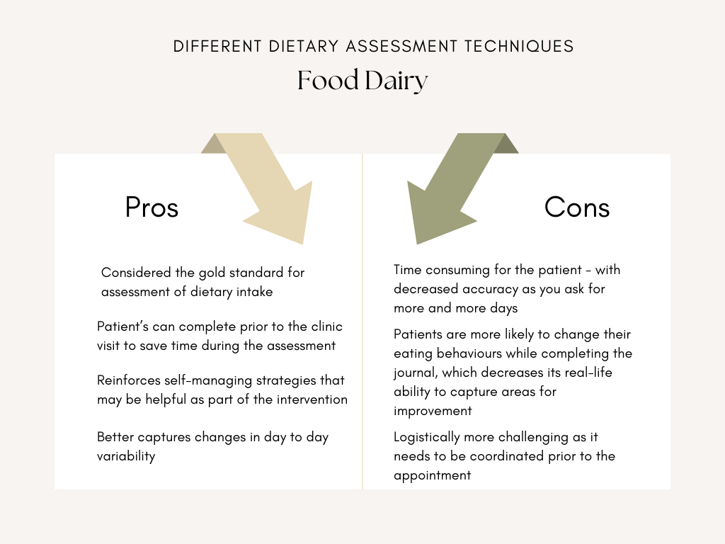 Taking a diet history is what makes dietitians unique from other healthcare providers. I often tell my students that you will most likely hear all members of the healthcare team give out nutrition advice. But, as dietitians, we are (usually) the only ones that give personalized nutrition advice. Because we take the time to assessment our patients dietary intake.