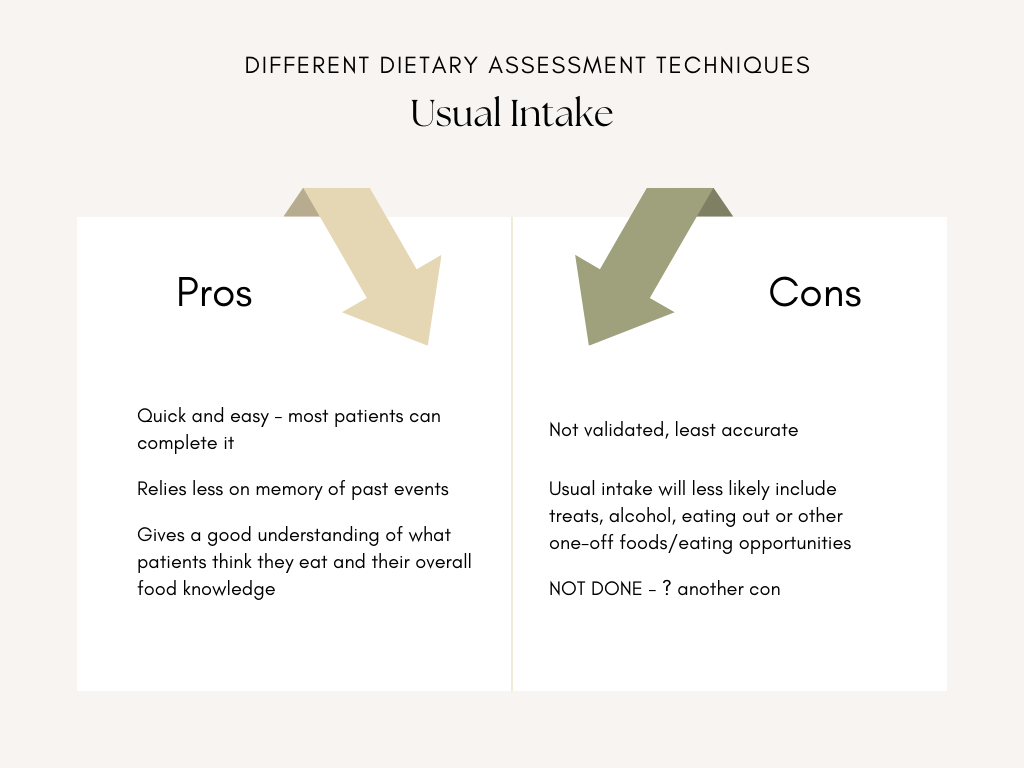 • I often ask about usual intake too. I do this to see how usual intake differs from the 24 hour recall. But usual intake only replaces a 24 hour recall if my patient has memory problems