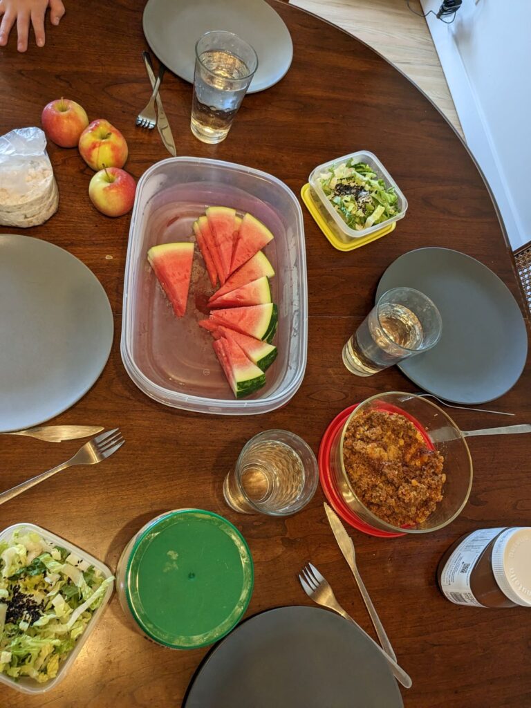 As I already mentioned, this week was not my ideal dinner state, as I didn’t get a chance to do much meal prep on Sunday. Fortunately we had leftover stuffing from the peppers, some cut up watermelon and leftover salad in the fridge. I rounded out the meal with a jar of peanut butter and some rice cakes.