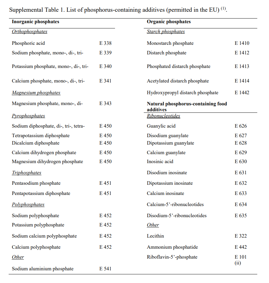 Most renal dietitians (and patients) are probably familiar with phosphorus additives such as phosphorus acid, sodium phosphates or potassium phosphate. In fact, a lot of phosphorus handouts recommend label reading for the term “phos”.
