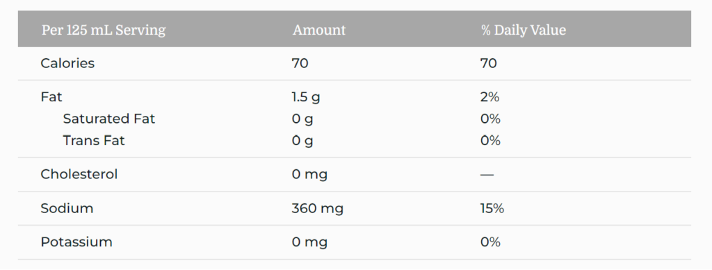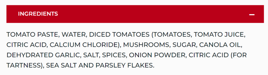 Check out this food label from Prego (https://www.campbellsoup.ca/product/prego-fresh-mushrooms-pasta-sauce-645-ml/):