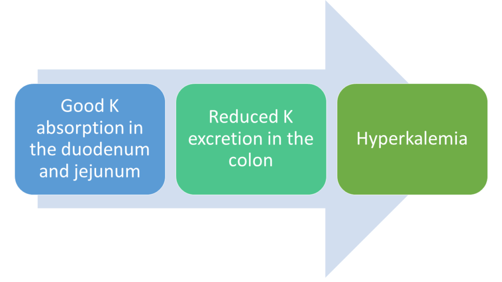 So for some patients with ileostomies, they can have good potassium absorption, +/- good water absorption, decrease colonic losses of potassium which results in hyperkalemia.