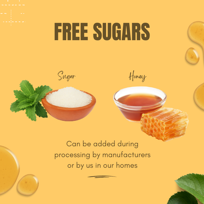 Free sugars are sugars that are added to foods or drinks during processing or cooking. Additionally, they also include sugars naturally present in honey, syrups, fruit juices and fruit juice concentrates.