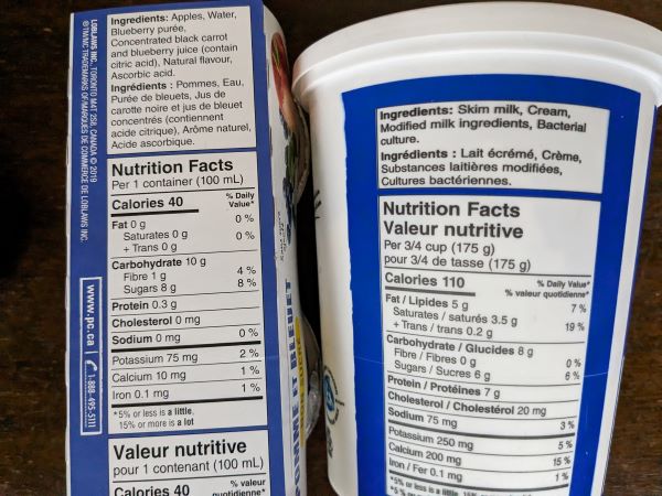 - Ingredient list – are sugars added as an ingredient? In the case of yogurt there is no sugar added so you know that all the sugar in this product is naturally occurring sugar. For the applesauce, the “Concentrated black carrot and blueberry juice” would count as added sugar.