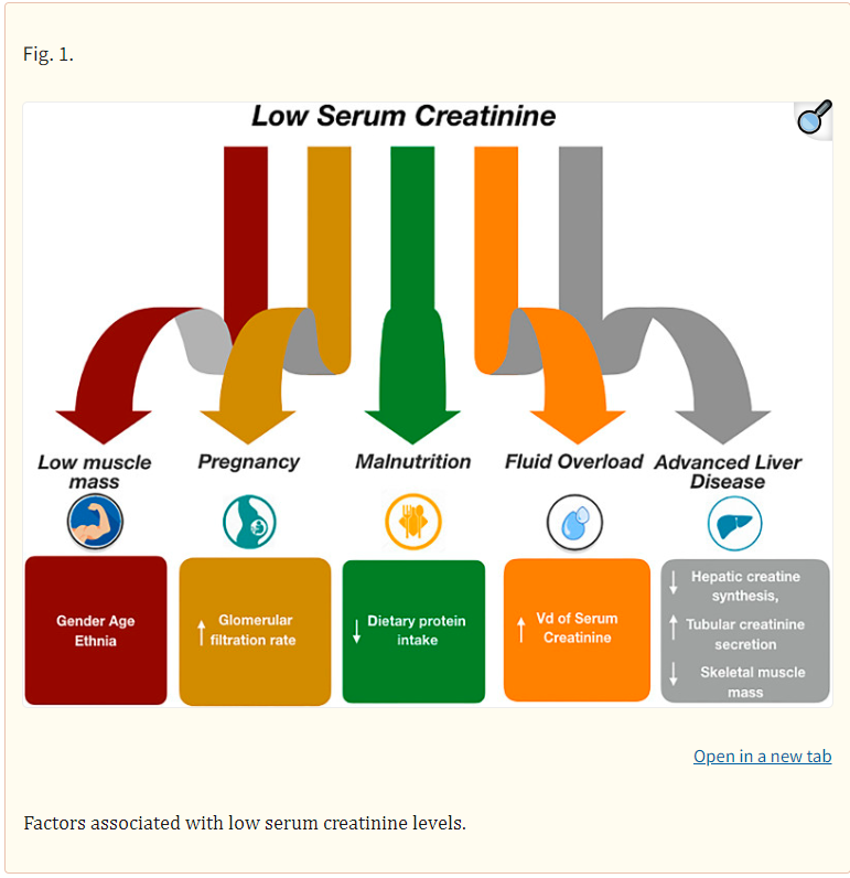 On the flip side, several factors can make creatinine go down. I really liked this figure, which I found in a 2023 paper published in Blood Purification. While this paper discussed factors that can explain low serum creatinine, consider that both muscle mass and volume status can be a 2-way relationship. Both high muscle mass and dehydration can be causes for high serum creatinine too.