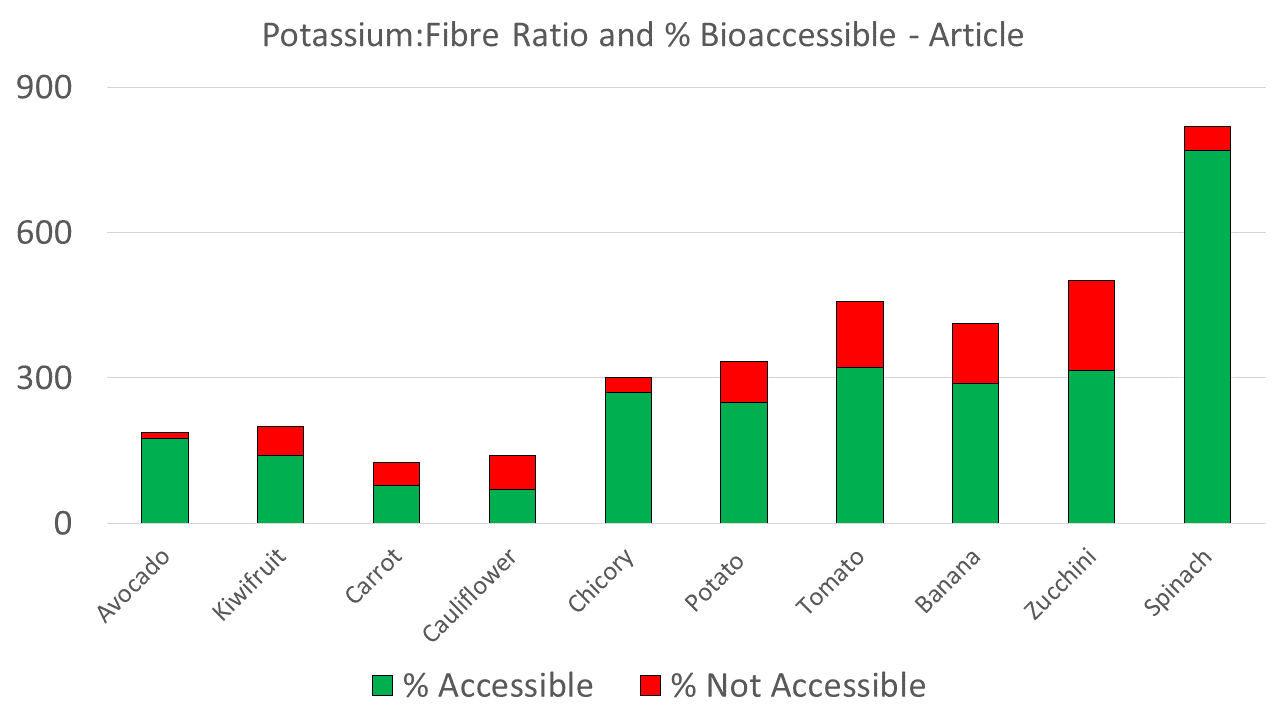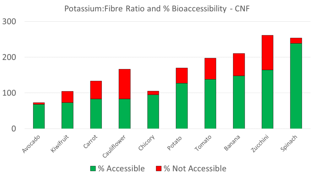 There are the numbers for the articles reported potassium content and the fibre ratio calculated from this number. What this graph shows is that despite increasing K:Fibre ratios, the % accessible/not accessible isn’t moving in a predictable way. For example avocado has a great K:Fibre ratio but had really high bioaccessibility. Zucchini had a “bad” K:Fibre ratio but actually had relatively low bioaccessibility at only 63%.