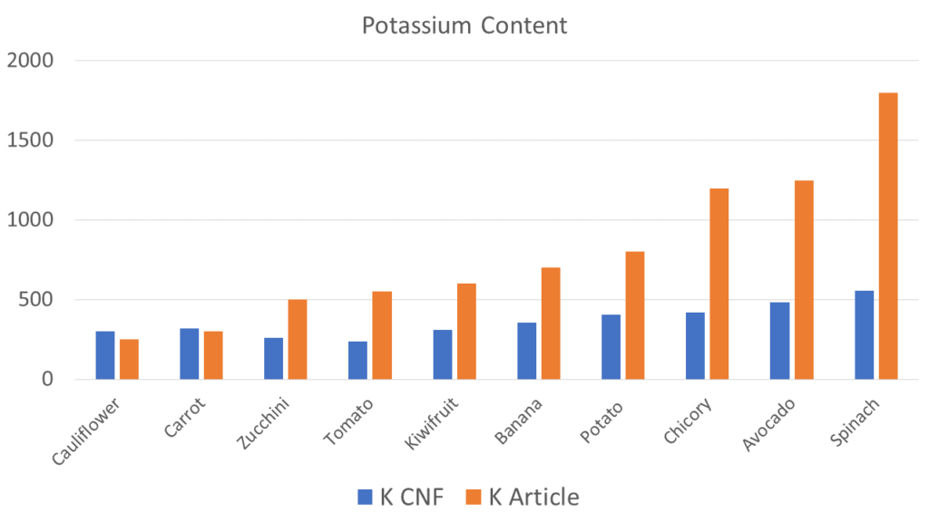 Why there are such differences I don’t know. I could hypothesize that it has to do with the growing locations of some of the foods, the ripeness of some of the foods or the methods used to determine the potassium content. Either way – the point is that potassium content isn’t static and even with great resources like the Canadian Nutrient File, it’s possible there is some misreporting.
