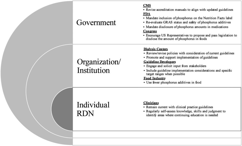 The final section of the paper presents a Call to Action at the clinician, institution, and government levels. At the clinician level, the authors recommend regular self-evaluation to ensure they are staying current in their practice. At the institutional level, efforts should be made to ensure clinic targets and policy documents reflect the most up-to-date guidelines. Finally, for the food industry and government, there is a push for greater transparency regarding the phosphorus content of foods.